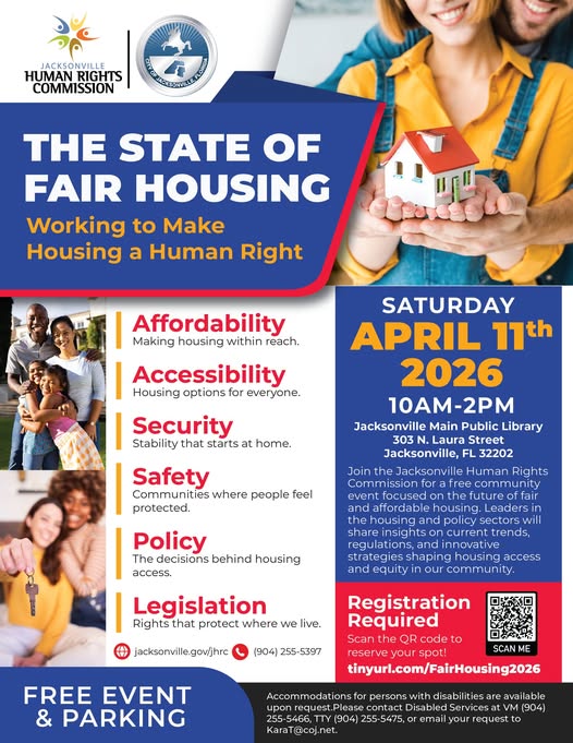 “Come join us for an important discussion on fair housing at the Jacksonville Main Public Library. We’ll be exploring ways to make housing a human right,” organizers said in a statement. “This event aims to raise awareness and promote positive change in our community.”