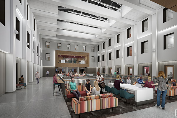 New features at Bachelor will include a modern TV studio; the Bachelor Great Room, a 68-person multifunctional space for events and teaching; a dedicated event space for the Humanities Center; and an atrium, a four-story space that will provide visual and physical connectivity to the core of the building.